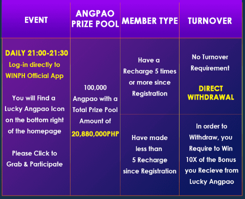 Please make sure to log in directly to the official WINPH app. Are not. ANGPAO in each round is LIMITED,