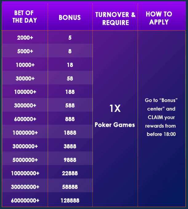 1 All players play and bet more than Php 2000 on cards Whether you win or lose in poker, you will receive a bonus.