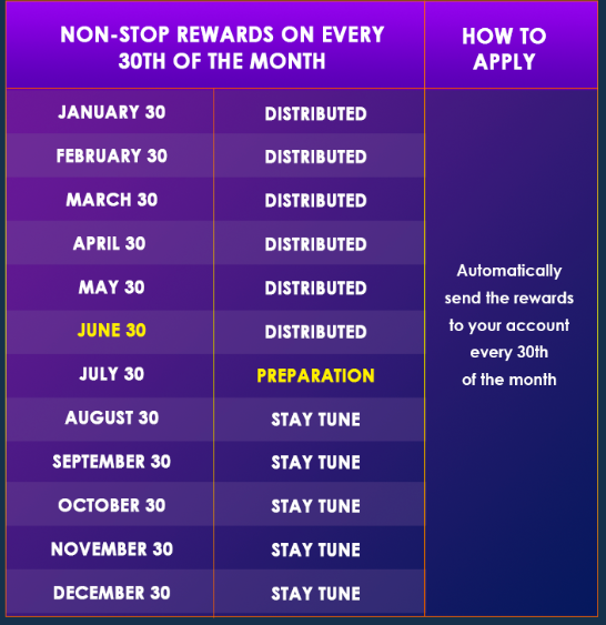 1 Reward on the 30th of every month, will be given announced 2-3 days before the 30th.